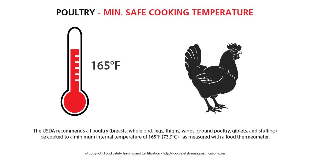According to the USDA, all poultry (breasts, whole bird, legs, thighs, and wings, ground poultry, and stuffing) should always be cooked thoroughly to 165˚F.